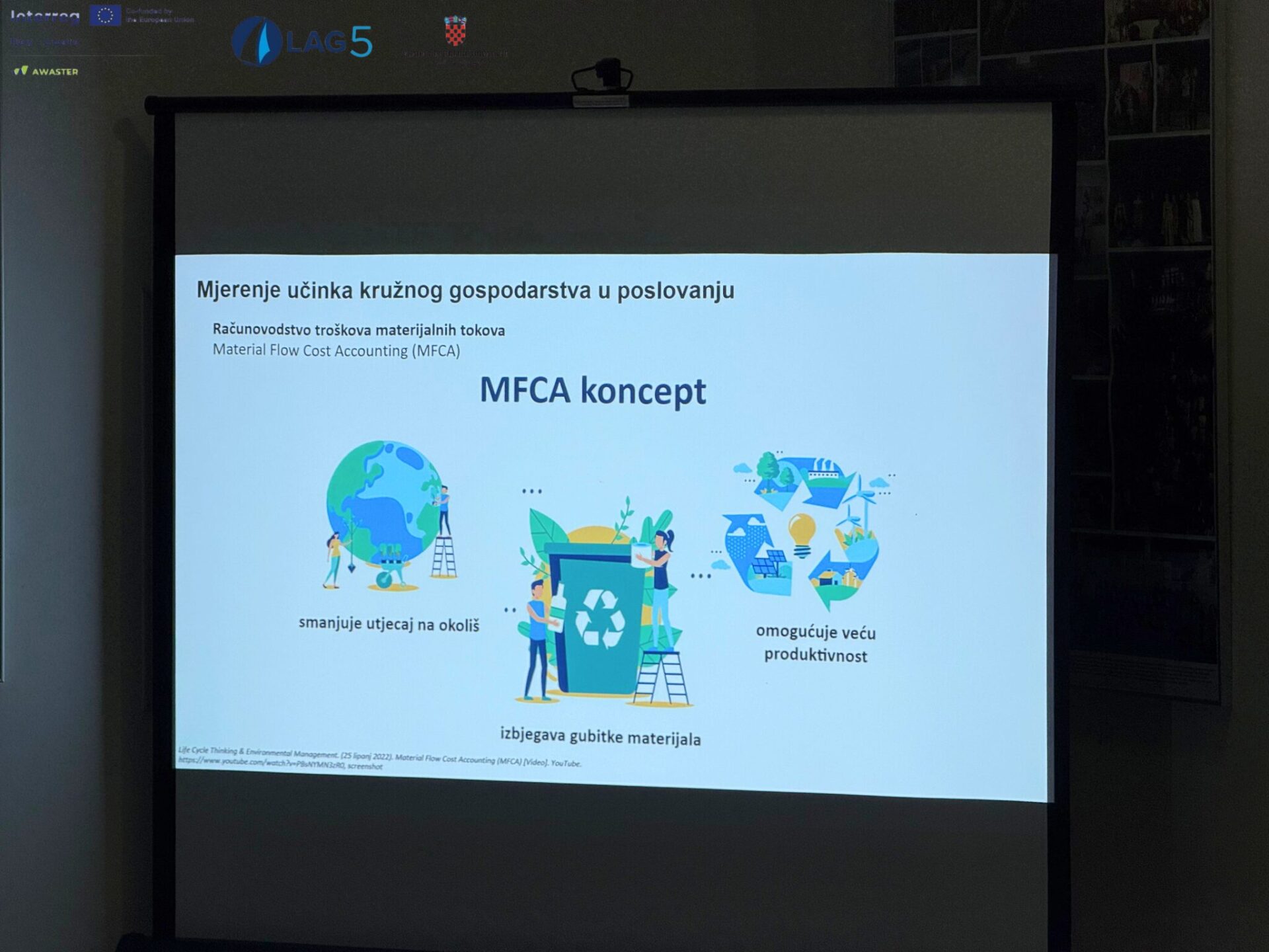Radionicu je organizirala Lokalna akcijska grupa LAG 5, a vodila ju je Marina Stenek, stručnjakinja za zaštitu okoliša. Sudionicima iz različitih gospodarskih grana: IT sektora, pomorskog prometa, modne industrije te ugostiteljstva i hotelijerstva, prikazano je, između ostalog, kako mogu mjeriti učinak kružnog gospodarstva u svom poslovanju primjenom metode Material Flow Cost Accounting (MFCA).